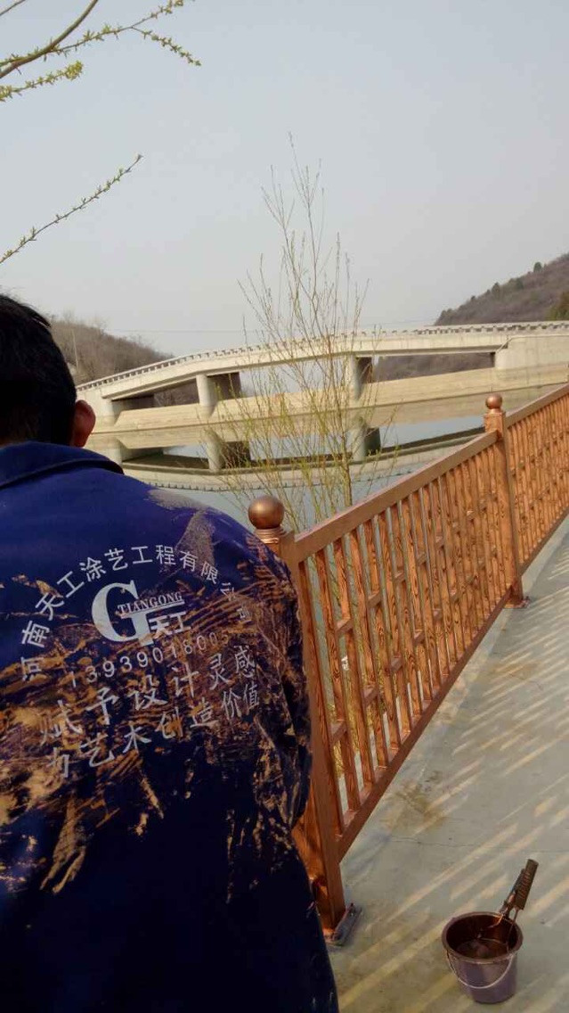 景區鋼結構護欄上刷上木紋漆效果,更加融合整個景區的環境,既滿足實用性又提升整體時尚感,水性木紋漆是護欄鋼結構首選藝術漆效果。